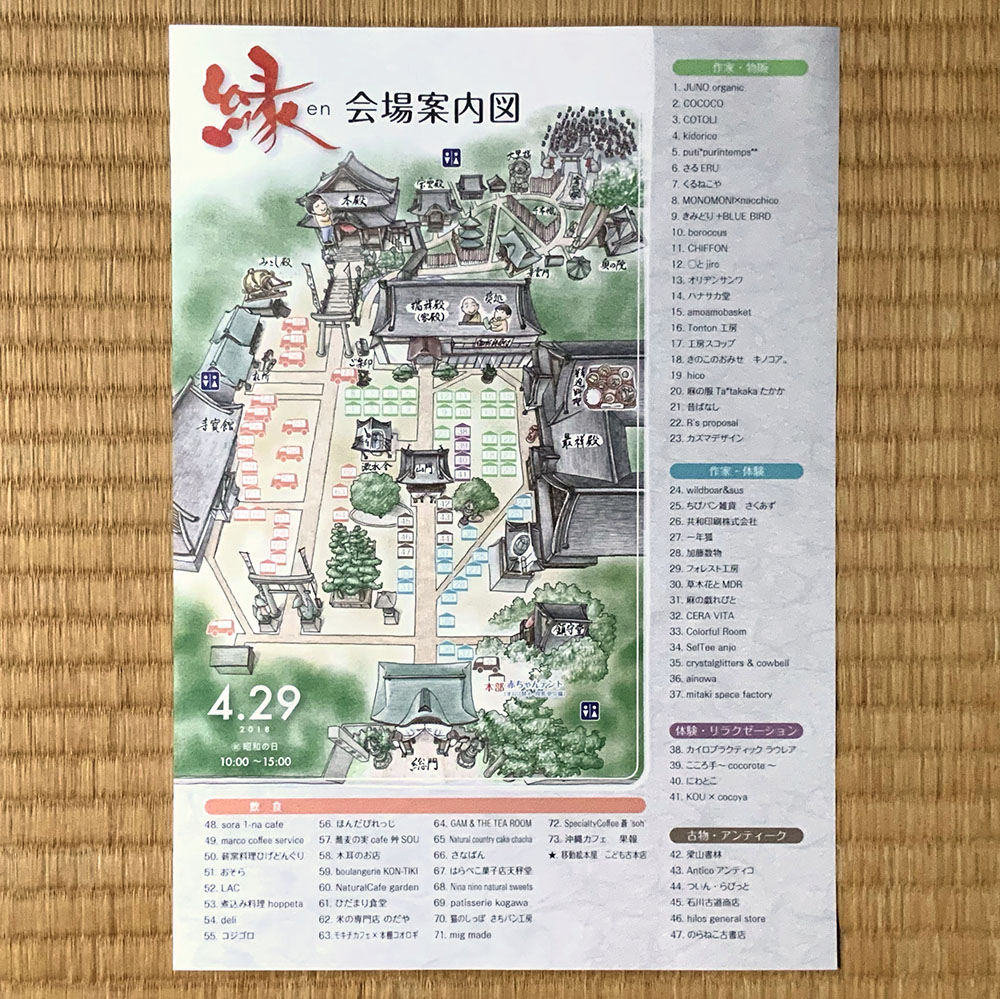 イベント「縁〈EN COUNTER AT TOYOKAWAINARI〉」会場案内イラスト 04/29/1807/29/25 | chiakiohtake モノづくりと美味しい食が集結したイベント。会場となる豊川稲荷のイラストを制作しました。 参拝もお楽しみいただけるように、境内の主要ポイントを網羅したイラストマップになっています。 デザイン:カズマデザイン