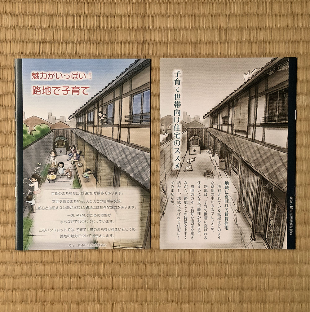 冊子「魅力がいっぱい!路地で子育て」制作 02/23/1907/29/25 | chiakiohtake 表も裏も表紙となった両A面仕様の冊子。左開きでは子育て世帯に向け、路地での子育ての魅力を発信、右開きでは路地物件所有者に活用を促す内容となっています。デザインとイラストを担当しました。 コチラから全文PDF版をご覧いただけます。 発行:都市居住推進研究会印刷:きょうとプリント