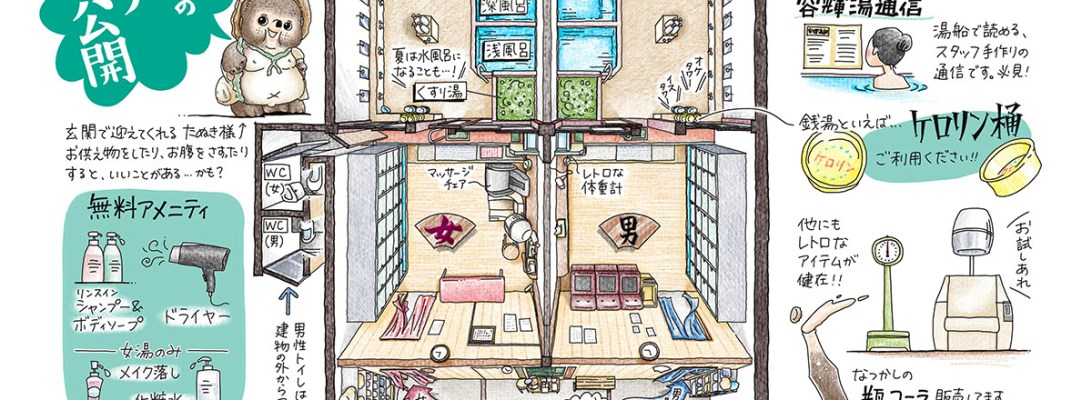 玉の湯様 チラシ制作 09/30/2101/14/26 | chiakiohtake 銭湯の宣伝用チラシ。イラストとデザインを担当しました。間取り図を用いて内部の様子がわかるようにしています。 玉の湯様HP