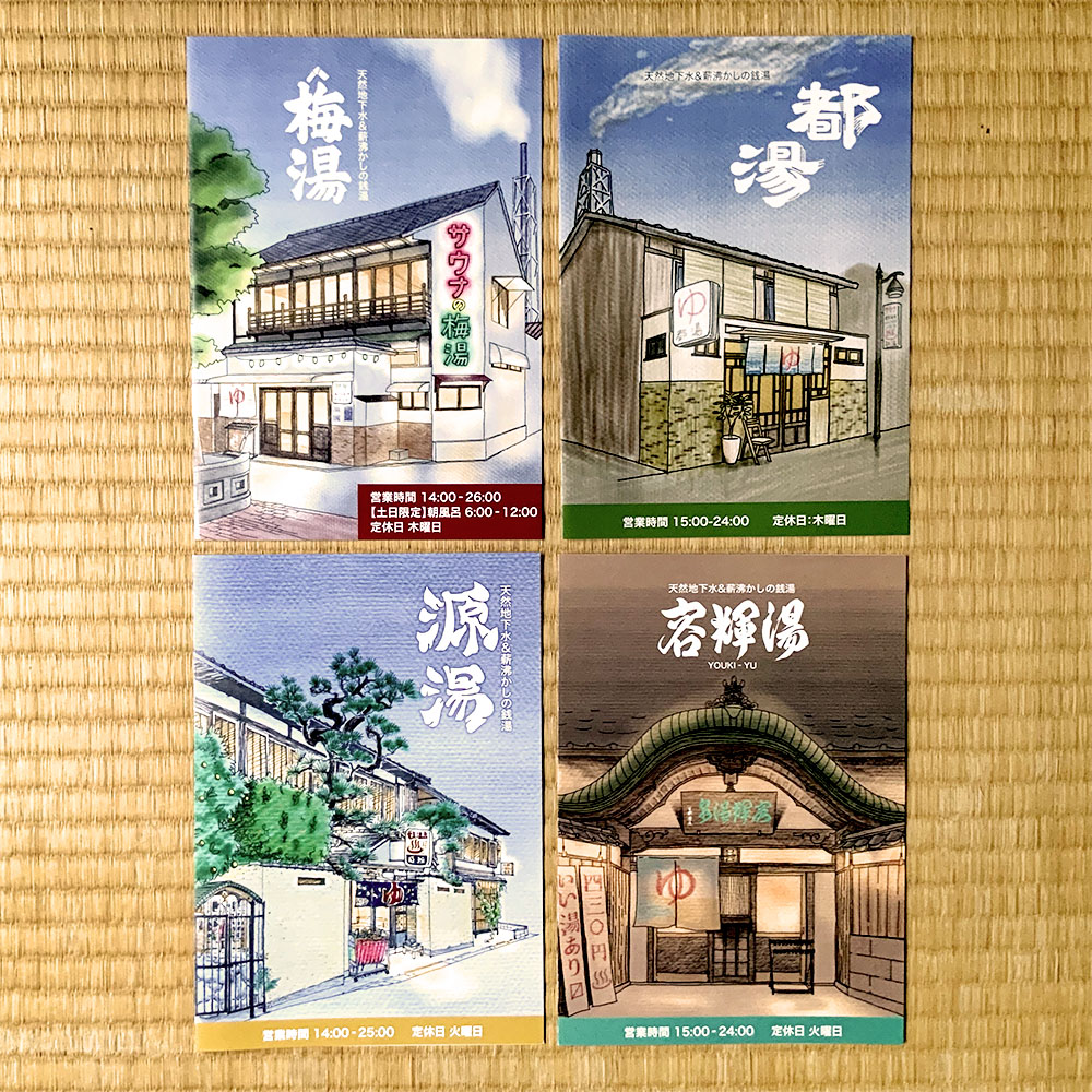 容輝湯様 パンフレット 01/10/2007/29/25 | chiakiohtake 銭湯の宣伝用パンフレット。イラストとデザインを担当しました。間取り図を用いて内部の様子がわかるようにしています。系列4店舗を制作させていただきました。 容輝湯様Twitter